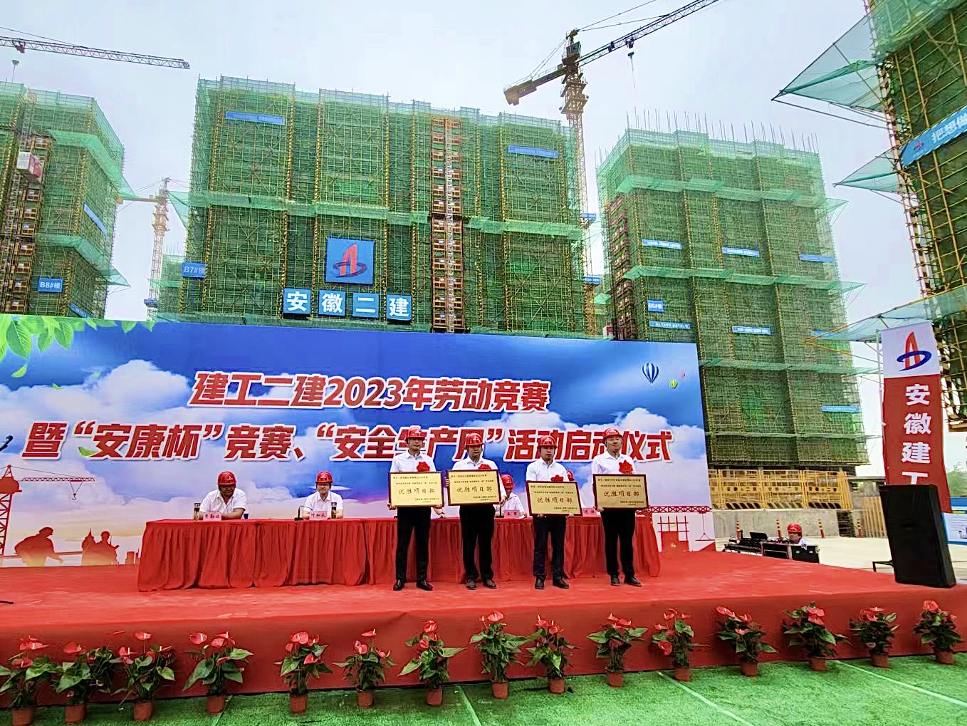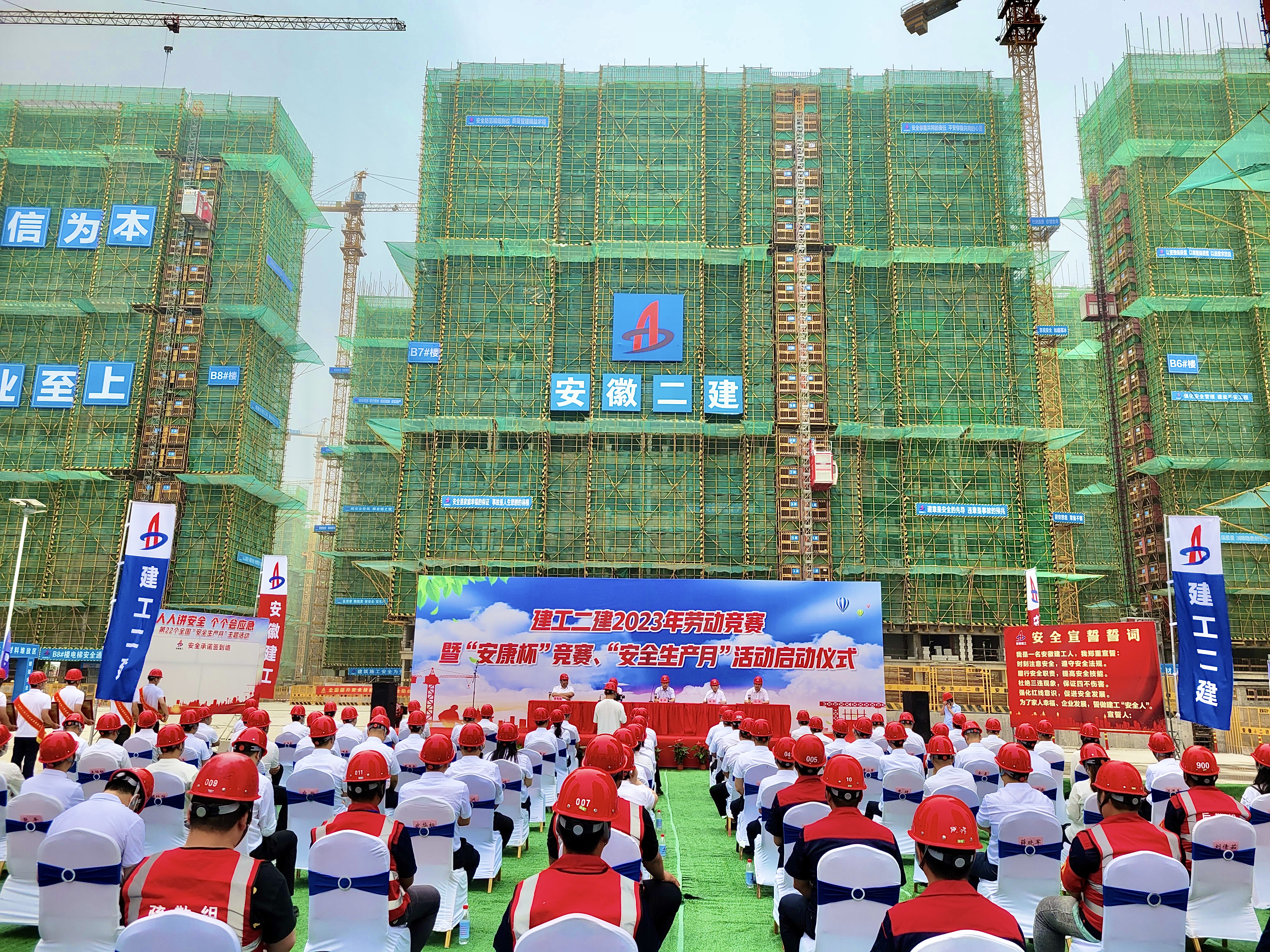 5月30日上午,建工二建在蕪湖中丞濱江時(shí)代項(xiàng)目現(xiàn)場(chǎng)舉行2023年勞動(dòng)競(jìng)賽暨“安康杯”競(jìng)賽、“安全生產(chǎn)月”活動(dòng)啟動(dòng)儀式。公司領(lǐng)導(dǎo)班子成員,勞動(dòng)競(jìng)賽委員會(huì)成員,所屬各單位主要領(lǐng)導(dǎo),分管安全、生產(chǎn)及質(zhì)量副經(jīng)理,工會(huì)(副)主席,工管科、安全科科長(zhǎng),公司工會(huì)、工程管理部、安全管理部、技術(shù)質(zhì)量部相關(guān)人員,受表彰先進(jìn)集體和個(gè)人代表等共百余人參加本次活動(dòng),公司黨委副書記、工會(huì)主席王軍主持啟動(dòng)儀式。