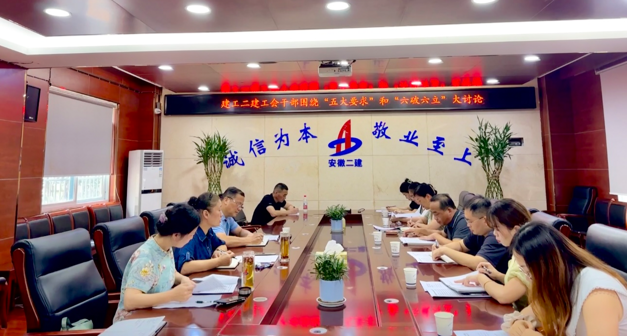 8月18日下午,建工二建工會干部圍繞“思想大解放、環境大優化、能力大提升、作風大轉變、任務大落實”和“六破六立”開展大討論。工會副主席、女工委主任王俊主持會議,公司工會工作人員、所屬各單位工會(副)主席、綜合辦工會干事參會。
