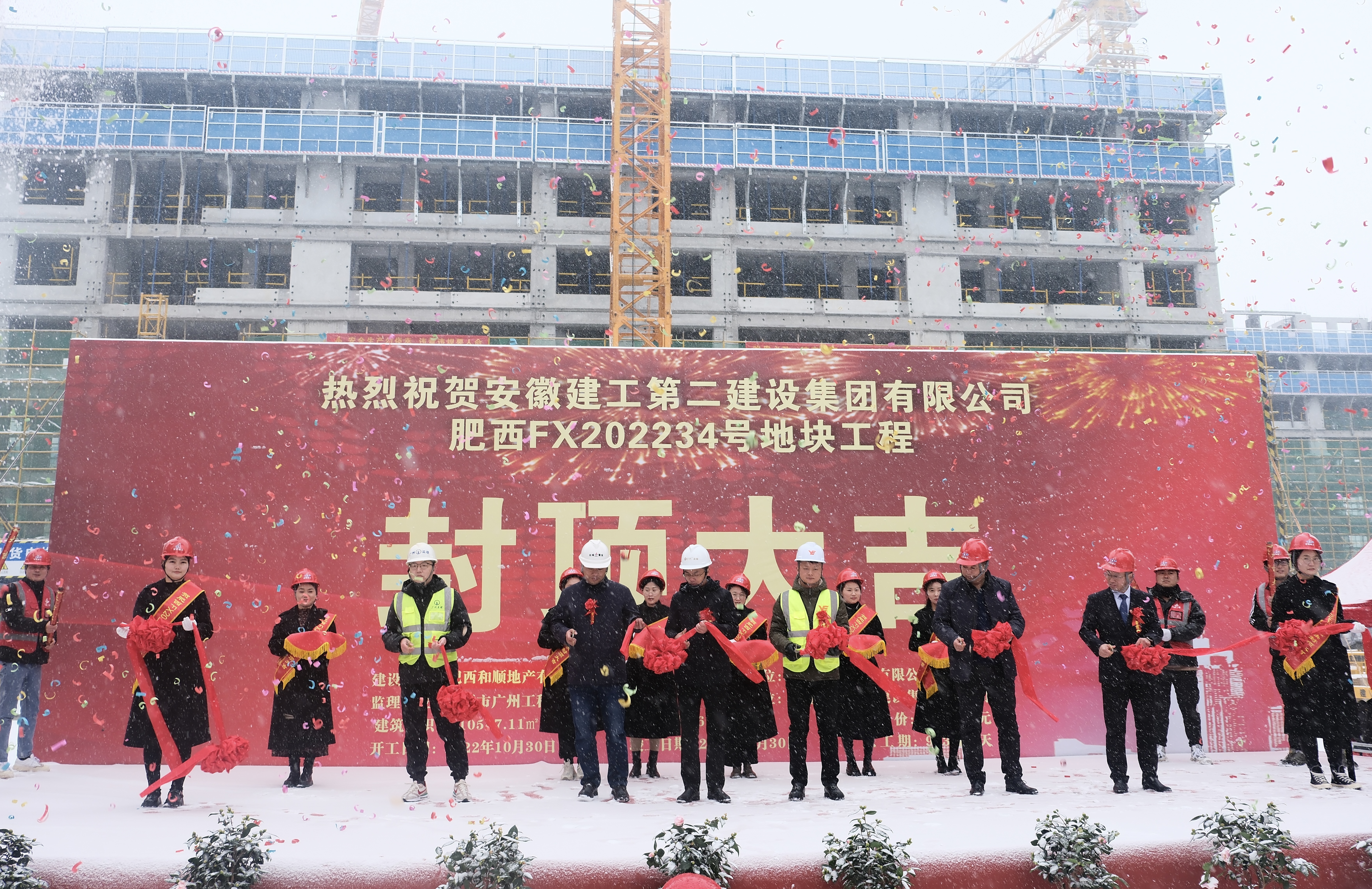 現場,安徽建工第二建設集團有限公司黨委副書記、副總經理李登祥、廣州工程建設監理有限公司安徽公司副總經理鐘書安、保利發展公司西南片區工程部部長潘向卿、越秀地產合肥公司副總經理文彩致辭,相關建設、施工、監理等單位的負責人一同為項目宣布封頂。