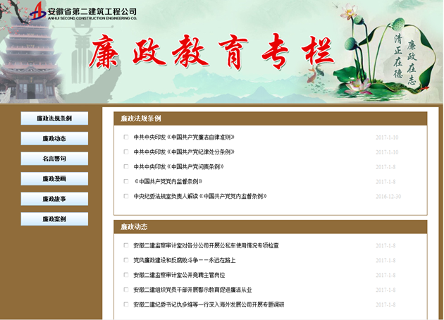 該專欄以公司網站為依托,設有廉政法規條例、廉政動態、名言警句、廉政漫畫、廉政故事、廉政案例六大板塊。通過廉政法規條例,轉載《中國共產黨廉潔自律準則》、《中國共產黨紀律處分條例》、《中國共產黨問責條例》、《安徽省預防職務犯罪條例》等一系列黨紀黨規、國家法律法規知識,并在每一次修訂后及時更新,為廣大黨員干部學習使用提供方便。運用廉政動態,及時發布集團紀委和公司黨委、紀委通知要求,通報監察審計事項與結果,做到監督的公開化、透明化。以名言警句、廉政漫畫、廉政故事、廉政案例感染人、陶冶人,內容直觀形象,用勤廉典型激勵人,深入剖析典型違紀案例,加強警示教育。