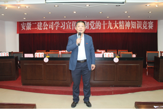 11月7日下午,安徽二建公司在原辦公樓三樓會議室舉辦了“學習宣傳貫徹黨的十九大精神知識競賽”活動。來自所屬各黨支部共計11支代表隊參加了此次比賽。公司黨委書記劉賢奇、總工程師邱立龍應邀出席會議,工會主席李林、紀委書記仇多維、女工部主任王俊共同擔任本次知識競賽活動的評委。公司機關各部門負責人,黨群部門全體人員,分公司黨政主要負責人、團支部書記觀看比賽。