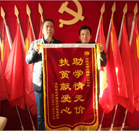 近日,安徽二建三分公司收到了鳳陽縣武店鎮武店村民委員會送來的錦旗,感謝安徽二建對當地一名貧困大學生的資助。