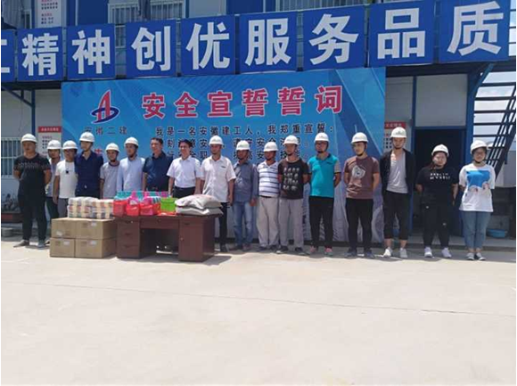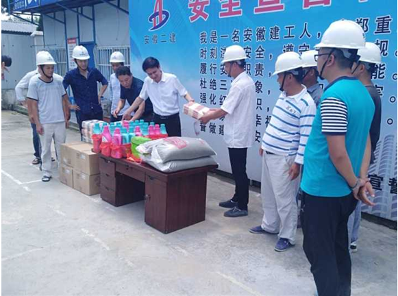 7月21日上午,驕陽似火,酷暑難當,集團公司工會副主席吳曉伍在公司工會主席李林的陪同下,不畏酷暑來到岳西潤業(yè)電商產(chǎn)業(yè)園開展“送清涼”活動,為奮戰(zhàn)在一線的員工和廣大農(nóng)民工送去了絲絲涼意,獻上了一份誠摯的關(guān)懷。項目經(jīng)理季風(fēng)帶領(lǐng)項目部全體成員迎接集團和公司領(lǐng)導(dǎo)并領(lǐng)取了集團公司為職工發(fā)放的防暑藥品、礦泉水、綠豆、毛巾、洗衣液等防暑降溫物品。