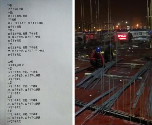 為完成春節前夕項目部7#號樓三層封頂、11#號樓四層封頂任務,二分公司領導班子高度重視,分公司生產副經理孟慶武扎根在一線監督指導。時間緊,任務重是項目部面臨的嚴峻挑戰,在困難面前,項目全體人員沒有退縮,制定了切實可行、精準高效的施工方案。一方面針對班組實行獎懲措施,兩班倒策略,對提前完成計劃任務的班組給與獎勵,對完不成的班組給與處罰。另一方面項目部全程跟蹤、精心組織,晝夜奮戰。在項目部全體員工的共同努力下,四天完成一層結構,充分發揚了二建人攻堅克難的精神。