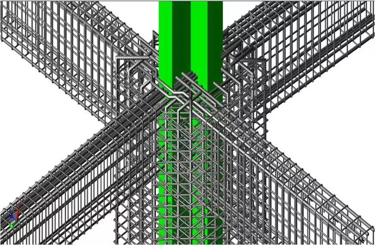 在復(fù)雜節(jié)點的地方,鋼筋的碰撞發(fā)揮著重要的作用。在型鋼混凝土梁柱節(jié)點處,鋼筋數(shù)量眾多,且因為型鋼的存在,造成梁的縱向鋼筋無法直接拉通。BIM工程師搭建節(jié)點模型,對鋼筋的排布進行調(diào)整,通過繞彎、預(yù)留洞口、焊接等方式,避免鋼筋與型鋼的碰撞。