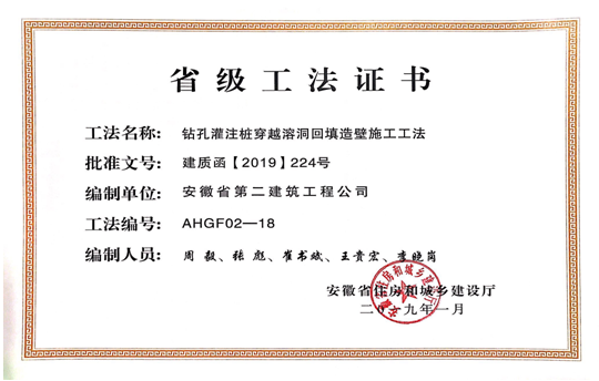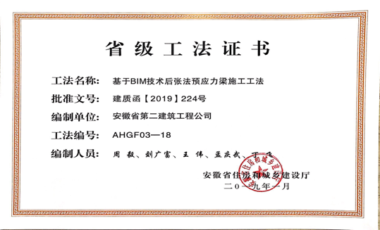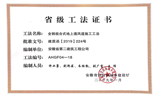 1月23日,安徽省住房和城鄉(xiāng)建設(shè)廳組織省級工法評審委員會,對企業(yè)申報的277項工法進(jìn)行了評審并予以公示。經(jīng)審定,“預(yù)應(yīng)力型鋼裝配式組合內(nèi)支撐施工工法”等103項工法為安徽省2018年度省級工法。由公司編寫的《鉆孔灌注樁穿越溶洞回填造壁施工工法》、《基于BIM技術(shù)后張法預(yù)應(yīng)力梁施工工法》、《全鋼組合式地上通風(fēng)系統(tǒng)施工工法》3項工法被評為省級工法。