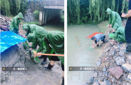 一分公司文一·塘溪津門項目全體人員積極響應公司及建設單位的號召,立即展開了一系列的抗洪搶險工作。針對D-09-04地塊金斗公園內部河道漫水至工地影響現場安全的情況,及時在河道漫水區域堆放沙袋,封堵漫水口,保河堤戰洪水,抗洪搶險奮戰一線。