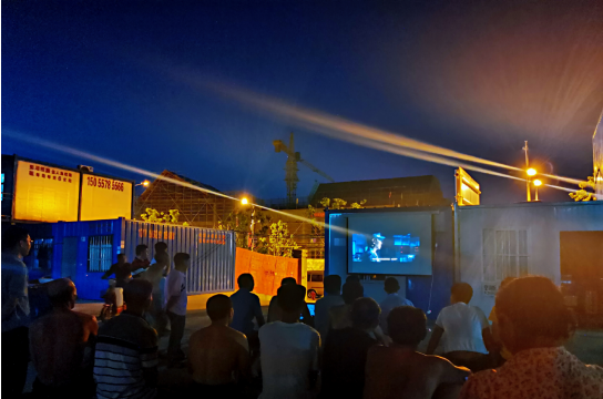 夜幕降臨,放映場上,辛勤勞作一天的工人們聚在一起,平時忙碌的工作,以及住宿條件的限制,每天的“兩點一線”讓他們的業余生活枯燥而單調,沒有那么豐富,通過在工人生活區放映電影,讓他們的業余生活多了一項文化娛樂項目,可以給他們帶來一場文化盛宴。