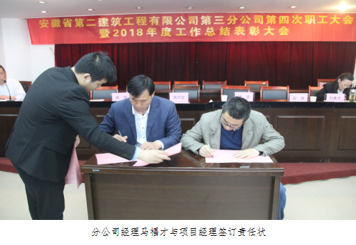 在分公司職工大會上,分公司經理馬福才與參賽的各項目經理簽訂了勞動競賽責任狀。其中阜陽吾悅廣場項目為新城控股開發,是分公司首次與上市地產公司合作,工期緊、任務重,項目經理表示一定會不折不扣的完成勞動競賽責任狀的內容,做到比、學、趕、幫、超,塑造二建良好形象。其他項目經理也一致表示會認真貫徹職代會精神,積極響應勞動競賽號召,為完成公司年度指標添磚加瓦,為黨的98歲華誕送上一份生日祝福。