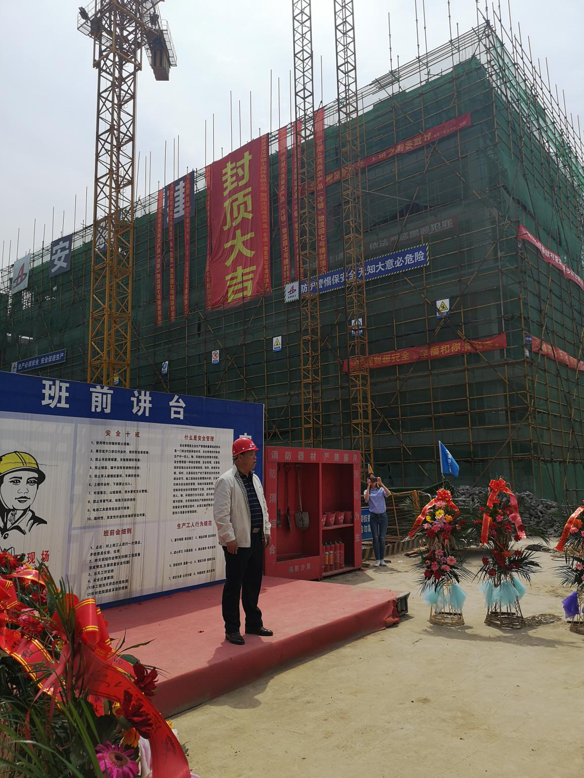 4月18日上午,安徽二建湖北陽新西商農產品(冷鏈)物流園一期工程1#、5#、7#、9#、11#、13#主體結構封頂儀式隆重舉行。湖北省西商農產品(冷鏈)物流園有限公司總經理劉俊、建設單位項目負責人張鼎、外聯負責人李輝、安徽二建四分公司黨支部書記董建民等相關領導共同見證了封頂時刻。