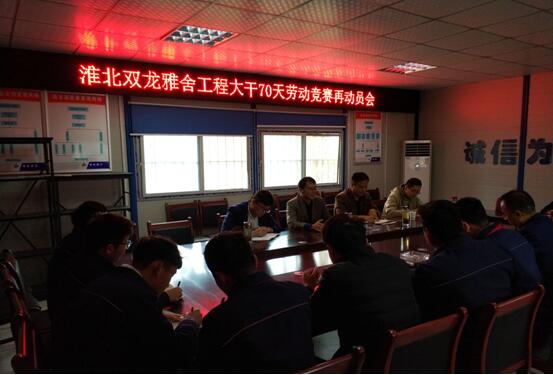 自十月初公司開展“大干70天”勞動競賽活動以來,淮北雙龍雅舍項目在項目經理盧因東的帶領下積極響應公司號召,合理安排工作計劃,精心組織施工部署,全面掀起大干熱潮。會上,崔書斌經理要求項目部繼續保持高昂的工作熱情,倒排施工計劃,抓住關鍵節點。蒯家江宣貫了公司勞動競賽活動精神,指示項目部落實 “比、學、趕、幫、超”活動方式,提高認識,端正態度。強調年輕管理人員要加強自身學習,提高工作執行力,養成良好的工作習慣;同時也要有面對挫折的勇氣,做到干一行愛一行,同心協力為二建的發展貢獻一份力量。