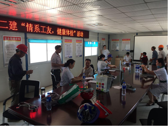 在會議室,工人們有序地排隊進行各項檢查,并不時提出各種健康疑問,醫生耐心的解答并指出夏季作業的注意事項。隨后,體檢結果由項目管理人員分發到工人手里,活動順利結束。
