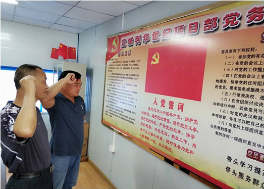 7月1日上午,項目部兩位黨員緊握右拳,面向鮮紅黨旗,重溫入黨誓詞?;仡櫲朦h宣誓時的莊嚴承諾和堅定決心,增強黨性意識,以更加飽滿的熱情發揮共產黨員的先鋒模范作用,永葆共產黨的政治本色。項目部19名成員抒寫了“我的承諾”,將一腔熱血鐫刻在紅色信紙上,并莊嚴鄭重的張貼上了宣傳欄,接受同志監督,時刻提醒自己。不忘初心,立足崗位,提質降本增效,以實際行動向七•一獻禮。