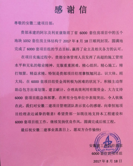 康斯坦丁6000套工程項(xiàng)目是由安徽建工集團(tuán)獨(dú)立總承包的項(xiàng)目,安徽二建公司承擔(dān)1032套施工任務(wù),建筑面積10萬(wàn)平米,合同額2.5億人民幣,此次結(jié)構(gòu)封頂?shù)氖瞧渲形鍌€(gè)地塊1032套住房。項(xiàng)目部在施工過程中,克服重重困難,科學(xué)制定施工方案,合理調(diào)配人員設(shè)備,精心組織,精細(xì)施工,抓管控保優(yōu)質(zhì),始終秉持“建精品、創(chuàng)一流”的建設(shè)目標(biāo),將工程質(zhì)量放在第一位。在項(xiàng)目部全體參建員工的努力下,康斯坦丁6000套項(xiàng)目的建設(shè)獲得了業(yè)主及相關(guān)各方的好評(píng)。安徽建工駐阿經(jīng)理部6000套項(xiàng)目組在感謝信中充分肯定了項(xiàng)目部的建設(shè)成果,高度贊揚(yáng)安徽二建項(xiàng)目部高效的管理水平和無私的敬業(yè)精神,并特別對(duì)安徽二建項(xiàng)目經(jīng)理章恒旭同志識(shí)大體、顧大局的工作作風(fēng)以及積極主動(dòng)、建言獻(xiàn)策的工作態(tài)度表示感謝。在信的結(jié)尾,6000套項(xiàng)目組對(duì)今后的合作也提出了期許,希望能夠攜手并進(jìn),共創(chuàng)未來。