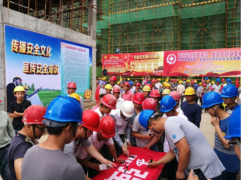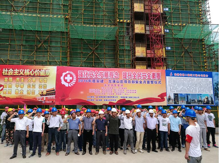 “我是一名安徽建工人,我鄭重宣誓:時刻注意安全,遵守安全法規。履行安全職責,提高安全技能。杜絕三違現象,保證四不傷害。強化紅線意識,促進安全發展……”。嘹亮的宣誓聲響徹整個施工現場,震撼人心。6月1日早晨7:00,在宿松安建·龍溪山莊工程施工現場,由業主、監理及安建·龍溪山莊項目部員工近百人組成的宣誓隊伍莊嚴宣誓,并簽字承諾,借此拉開“安全生產月”活動序幕。
