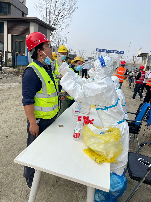 為配合做好核酸檢測(cè)工作,項(xiàng)目青年志愿者在現(xiàn)場(chǎng)維持秩序、設(shè)置點(diǎn)位、劃分區(qū)域,按10人為一組配合醫(yī)護(hù)人員采集咽拭子。醫(yī)護(hù)人員身著防護(hù)服、頭戴護(hù)目鏡,快速精準(zhǔn)地為項(xiàng)目管理人員和一線工人采取樣本,并進(jìn)行信息登記。