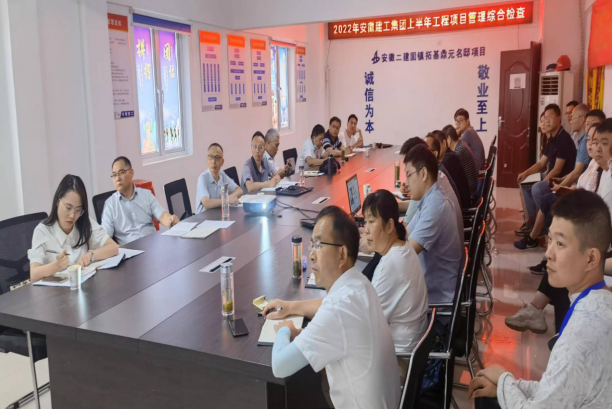 為扎實推進“項目基礎管理年”活動,以檢查促落實、促整改、促提升,2022年6月28日,建工股份公司工程管理部(安全監察局)督查員范毓慶一行8人赴安徽二建固鎮拓基鼎元名邸項目,開展上半年工程項目管理綜合檢查工作。安徽二建公司黨委委員、副總經理葉和永,總經理助理、第一分公司經理崔書斌及公司相關職能部門負責人參加。
