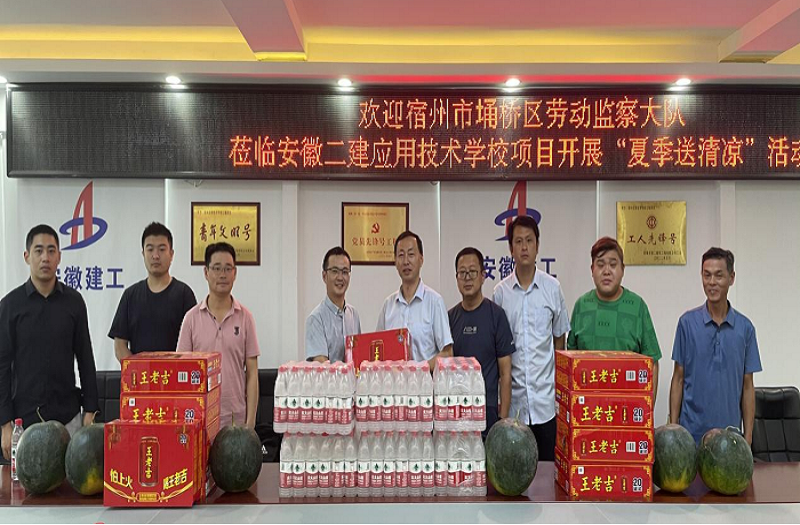 烈日炎炎,酷暑難當,為確保一線工人身心健康,督促做好夏季高溫期間安全生產工作,7月15日上午,宿州埇橋區勞動監察大隊黨支部書記、副大隊長王建一行赴安徽二建宿州應用技術學校項目開展“夏季送清涼”活動,為奮戰在高溫下的建筑工人送來了真摯的問候和關懷。